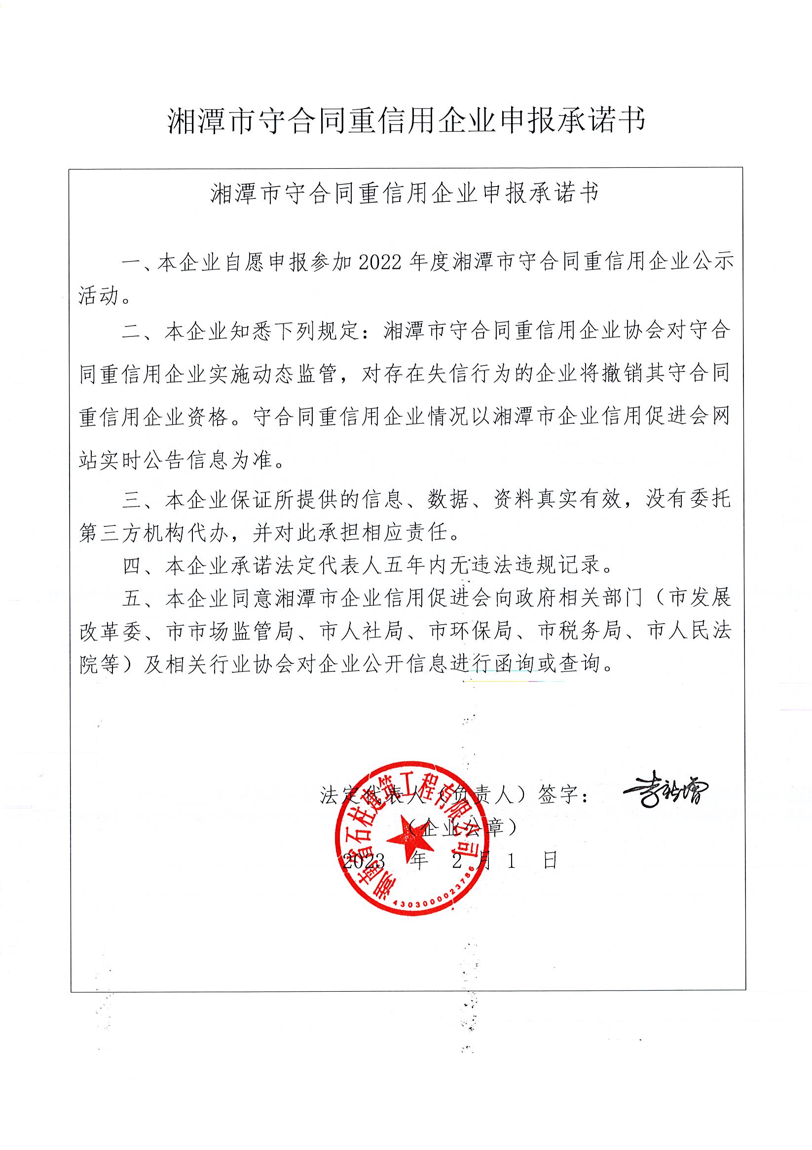 本企業(yè)根據《湘潭市守合同重信用企業(yè)申報規(guī)定》等編制 2022 年度企業(yè)信用報告書,并保證本報告書內容真實、準確、完整。