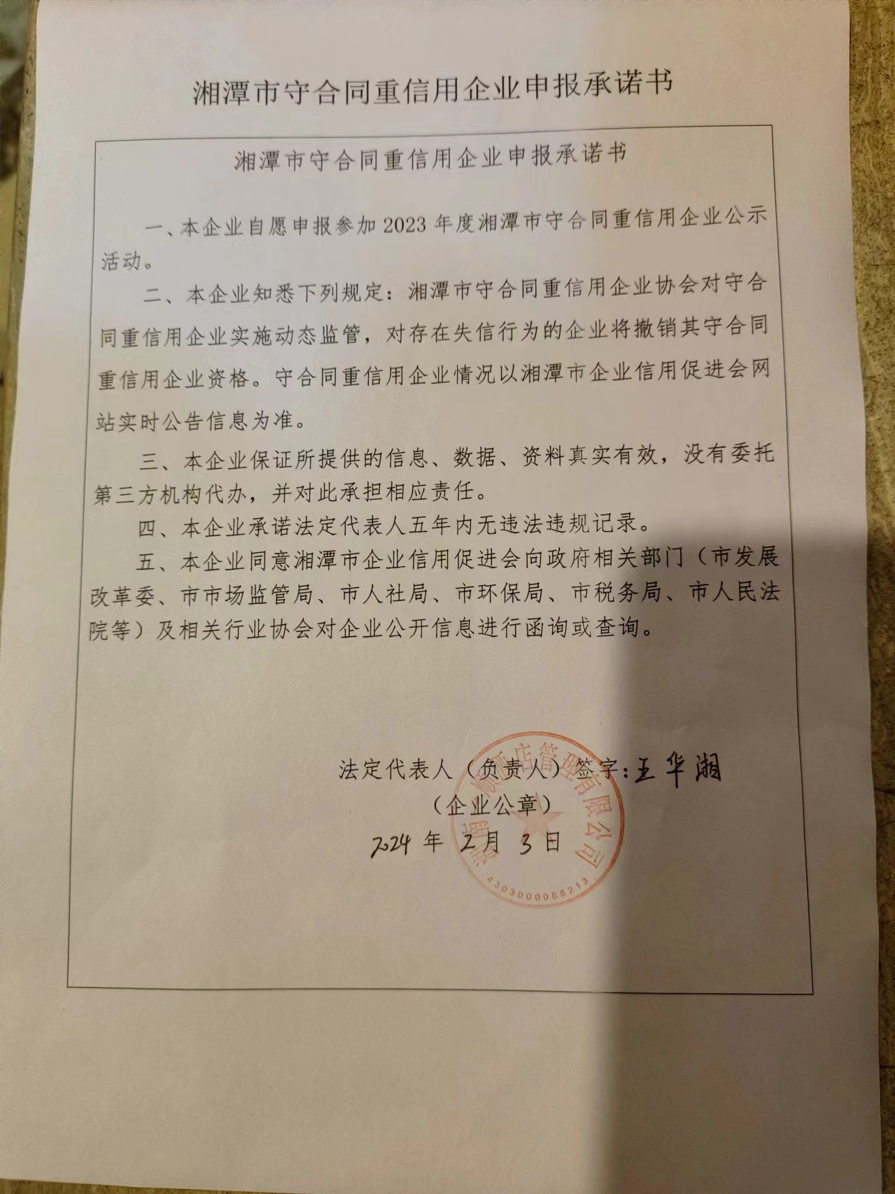 本企業根據《湘潭市守合同重信用企業申報規定》等編制 2023 年度企業信用報告書,并保證本報告書內容真實、準確、完整。