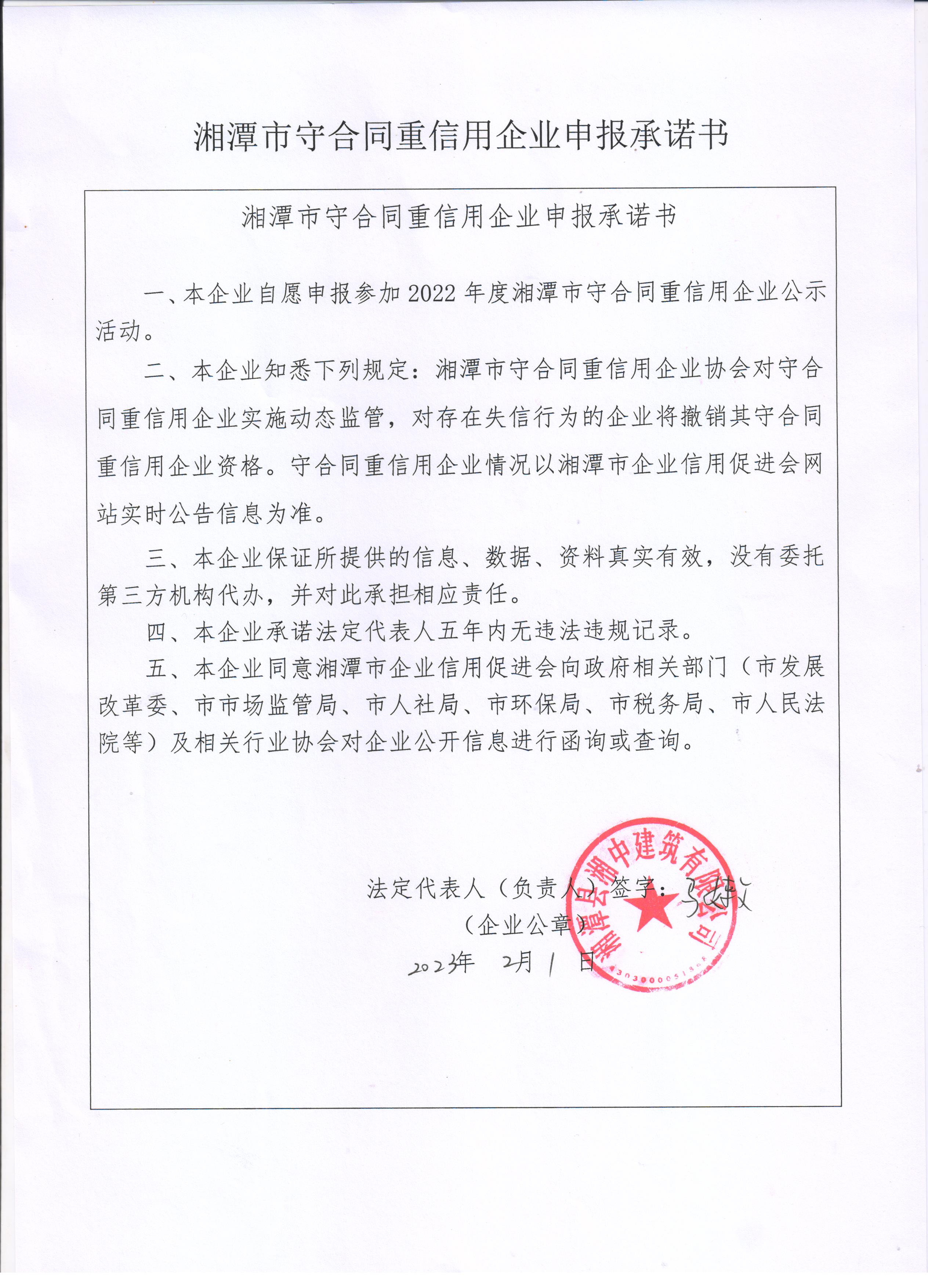 本企業(yè)根據(jù)《湘潭市守合同重信用企業(yè)申報(bào)規(guī)定》等編制 2022 年度企業(yè)信用報(bào)告書,并保證本報(bào)告書內(nèi)容真實(shí)、準(zhǔn)確、完整。
